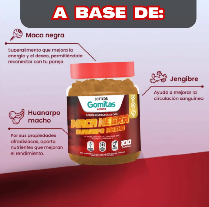 🏥 La combinación de Maca Negra, Huanarpo Macho, Zinc y Vitamina D ayuda a regular las hormonas, mejorar el desempeño y fortalecer la salud masculina. Su formato en gomitas facilita su consumo diario. – Dr. Manuel Rodríguez, Nutricionista.